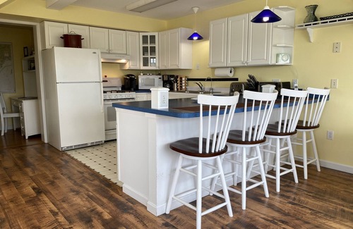 On the other side of the first floor there is a half bath with laundry appliances. Both bathrooms have full sets of L.L. Bean towels and Maine-made soaps! There is also a media room which has wall to wall carpeting, a comfy couch, and a 58' flat screen TV! It's like your own mini theater! (The couch converts into a queen-sized guest bed)! The microwave also makes perfect popcorn!