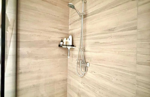 Travelers have access to the entire duplex: bedrooms, living room, modern bathroom with walk-in shower, dressing room, and fully equipped kitchen.
