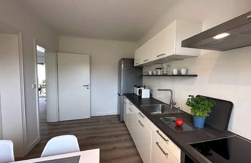 The modern kitchen is very high-quality and fully equipped, and the kitchen table invites you to enjoy cozy meals.