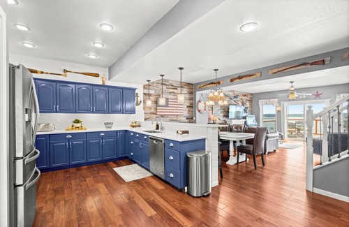 New for 2025 renovated Master Bath with slipper tub and large shower with body spray jets! Amazing million dollar views, lots of space for families to spread out, two separate living areas with separate entrances, full kitchens, livings areas and bedrooms. Four decks with seating and loungers, large dock with open 26' slip and huge swim platform, 2 kayaks and 2 SUP's, ping pong table, pool table, Star Wars pinball machine, 60 game cocktail table arcade with Donkey Kong, Pacman, Frogger, etc PlayStation 5 game, Wi-Fi, vintage 18' ball bowling machine, board games, screened in porch, tiki bar, gas fire pit sitting area, SS Weber LP gas grill, sun lounging deck, covered hot tub overlooking lake, animal friendly hardwood flooring/LVP flooring, ample parking including 2nd tier overflow parking, master bedroom and bedroom #2 have amazing views with sliding doors leading out to private deck, cove located at 5 1/2 MM off the main channel, great central location with easy access to many popular restaurants and bars. Security camera only in front of the house. One small dog allowed at $30 per night. Must let owner know at time of booking if you will be bringing a dog and provide breed and weight. Will send a separate payment request if not included in booking request.