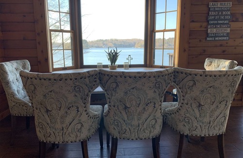 Main level living space is an open floor plan among the living room, kitchen and dining space with plenty of comfortable seating and different vantage points for lake views. There is a floor to ceiling stone fireplace with gas logs shared by the living room and master bedroom. Knotty pine walls and rustic decor compliment the cabin feel. Master bedroom is on the main level with king bed, master bathroom and walk in closet. Also on the main level is another bathroom and two additional bedrooms - one with king bed and one with full sized bunkbeds. Downstairs is another living area with 65" TV, pool table, bathroom and two bedrooms - one with King and one bunk room with 4 twin sized beds plus a trundle bed with two additional twin mattresses making 6 beds total. Downstairs level walks out onto huge lower level deck with outdoor seating/dining space, gas fire table, and brand new hot tub. We have separate heating and cooling systems (both replaced 2021) for upstairs and downstairs, both controlled with wifi thermostats.