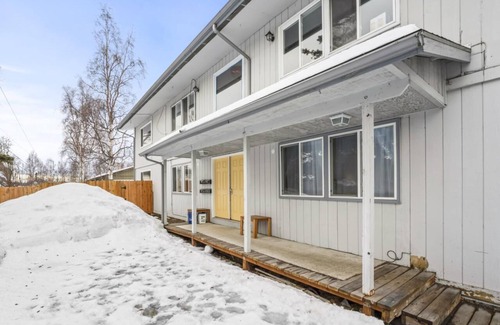 This expansive apartment, one of four in the building, is situated on the upper level, offering additional natural light and a partial view of the Chugach Mountains. Updated in 2022, it features new vinyl plank flooring, kitchen cabinets, and appliances. Each bedroom boasts a new queen-sized hybrid memory foam mattress for optimal comfort. The convenience of an in-unit washer and dryer is complemented by complimentary Wifi and TV streaming services. Relax on the oversized couch and watch your favorite film on the 70" TV. Parking is conveniently located directly outside the building at no extra cost. Please note that while this unit does not allow pets, other units on the premises do, which may affect guests with pet allergies.