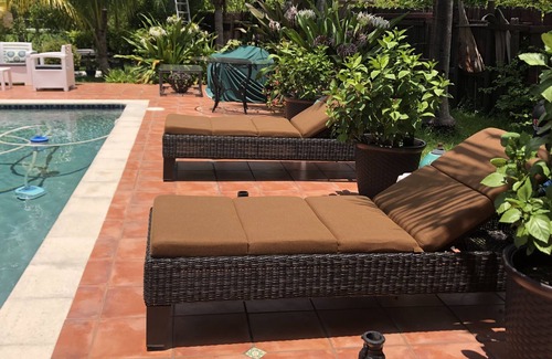 A brand new private studio we have just renovated, off the main section of our home. Guests have their own private entrance and free parking just outside. Guests will be able to swim in a beautiful large pool from 9 am to 10 pm and to enjoy a backyard oasis of plants and sunshine.