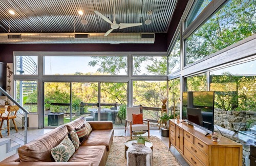 This extraordinary glass-walled home in the heart of Austin and the Hill Country offers breathtaking canyon vistas from every angle. Perfect for couples, a group of friends, or young families seeking an unforgettable retreat, this unique dwelling is a once-in-a-lifetime stay! Or even twice, as we’re certain you will want to return. Floor to ceiling windows not only allow for an abundance of natural light to flood the home but also keep you fully immersed in the outdoors even while enclosed inside. You won’t have to worry about privacy as the property is surrounded with mature trees and landscaping keeping you and your guests desirably secluded. The outdoor space offers plenty of opportunities to take in the fresh air and incredible views with an abundance of comfortable seating areas to choose from. When you’re ready to venture away from the home on a day trip to explore the area, you’ll be just 35 minutes away from Austin proper where you can visit all of the city’s hottest attractions or enjoy a meal out at one of many fantastic restaurants. Closer to the home, Lake Travis offers ample opportunity to spend a day around or out on the water, with nearby parks offering even more outdoor enjoyment.