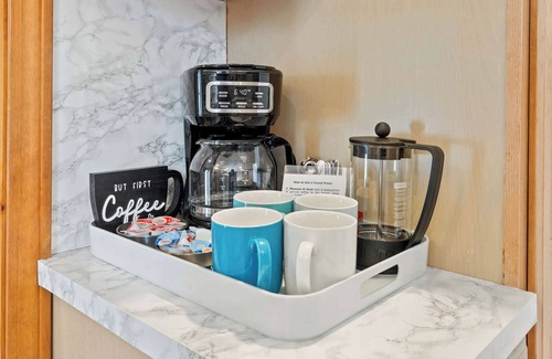 The fully equipped kitchen allows for easy meal prep and clean-up. Coffee lovers will enjoy 3 different options for making coffee including a drip coffee maker, a French press, and a single-serve Keurig. Complimentary coffee, tea, sugar, and creamers are provided. A water filtration system in the kitchen eliminates the need for guests to buy bottled water! Seating for six is available with both indoor and outdoor dining options. Fast Wi-Fi exists throughout the house, and a charging station is provided.