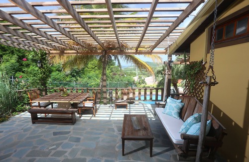 Original paintings, driftwood, stone floors, wooden decks, waterfall and a beautiful pool with color changing LED lights, herb garden, hammocks Ocean views are just some of the eye pleasing features of Zatarra House.