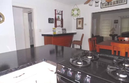 The entire house has been nicely updated while maintaining some that historic charm. The open kitchen is of ample size and fully equipped with a full size stove, oven, fridge, microwave, coffee maker, along with all the cookware, dishes, utensils, silverware and glasses you should need.