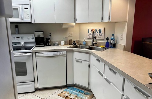 Cozy Condo by the Sea!! Come and make yourself at home in this bright and beautiful 5th floor condo and enjoy sunrises over Sarasota bay and sunsets over the Gulf of Mexico! Steps to the 1/4 mile private beach with 2 bedrooms, 1 bath and separate vanity area with sink. You'll fall in love with the 1,019 square feet of room to roam, decorated with all the comforts of home and beach shabby chic decor! Screened lanai with adorable high top cafe table to enjoy your morning coffee or happy hour cocktails! Fully equipped kitchen, king sized bed in master bedroom, two twin beds in 2nd bedroom, Smart TVs in living area and both bedrooms and high-output wifi. Equipped with washer & dryer, newer AC and hot water heater.