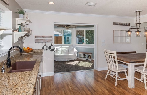 Open floor plan vaulted 16' ceilings in the great room. ADDITIONAL NEWLY BUILT 2 BEDROOM IN-LAW SUITE detached from the house the house. 600 sq ft, 2 bedroom, 1 bath with full living room, dining and kitchenette with secondary private pergola through the glass garage doors. see pics and message for additional info. House sleeps 10 with the secondary home out back through the courtyard.