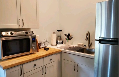 Adorable first floor guest studio with high ceilings & bright welcoming decor. Private entry with private driveway. 2 minute walk to beach with direct beach access at end of road. The kitchen has a full refrigerator, microwave, toaster oven, 2 burner hot plate, coffee maker, blender, dishes, pots, pans & utensils. Washer and Dryer inside unit. Cable & wifi provided. Living area has a full size couch and drop leaf table for dining or laptop workspace. Small (less than 30 lb) well trained/ house trained dogs welcome. $125 non-refundable pet fee applies. 2 dogs max.