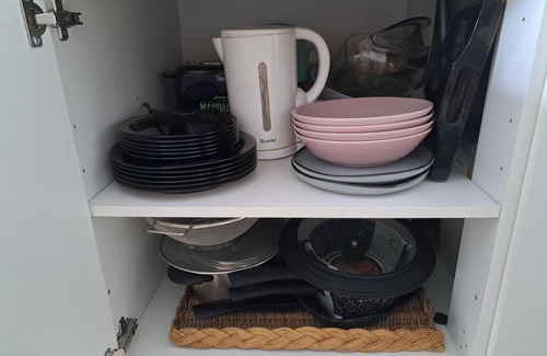 This 1-bedroom, 1-bathroom rental features air conditioning and a desk. Bathroom amenities include a hair dryer, towels, and toilet paper. The kitchenette is equipped with a stovetop and a refrigerator, as well as a coffee maker, an electric kettle, and a lobster pot.