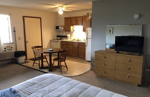 This unit comes with a King sized bed, kitchenette with dishes and silverware, Smart TV, and WiFi. Sleeps 2. We are far from town on a quiet paved road.