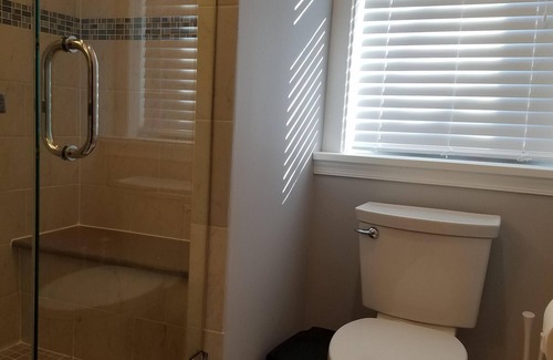 Wide, well-lit stairway leads to 2nd floor: Master Bedroom (queen bed) with large en suite master bath with soaking tub, tiled shower and vanity area; 2nd bedroom (queen bed) and 3rd bedroom (2 twin beds that can be moved together) and large home office share a 3rd large bathroom with tiled shower and vanity. Washer/dryer located on same floor as bedrooms. Hardwood floors, Persian-style rugs, walk-in closets. 3 large TVs with Fios (living room, office and Master Bedroom) and free WiFi.