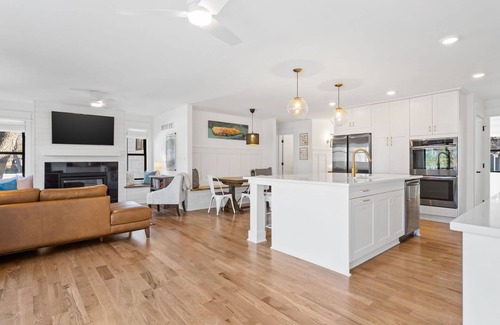 Step into a peaceful, sunlit living space designed for comfort and relaxation. The living room features a large sectional sofa that seats five, a cozy armchair, and a gas fireplace—perfect for unwinding after a day out. Enjoy your favorite shows and movies on the Smart TV, or unplug with a selection of books and board games for a cozy night in. Soft throw blankets and pillows are provided to make you feel right at home, and with high-speed internet, you’ll have everything you need to stay connected or stream with ease.