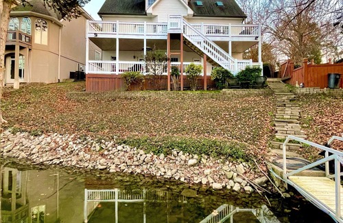 Stunning lakefront retreat with private dock and water access, including BOAT RENTAL(optional), hot tub, kayaks, pedal boat, floats, and other water toys. Come enjoy a sanctuary on the water– also just 20 minutes from vibrant downtown Nashville. Modern home with 4 bedrooms, large fully stocked kitchen w/bar seating, full dining room, and spacious living room. Double-level deck allows for sunning upstairs or shade downstairs, and fire pit!