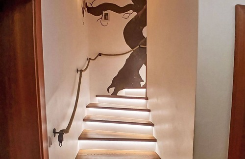 The unit is a 5-room apartment that spans 180 square meters across two levels. The living/dining room features modern and cozy furnishings, complete with an open-hearth fireplace and a satellite TV (flat screen). The open kitchen is equipped with four hot plates, an oven, a dishwasher, a toaster, a kettle, and an electric coffee machine, as well as a dining table. On the lower ground floor, you'll find two double bedrooms and two additional rooms, each with one bed. The apartment also has a bathroom and two separate toilets.
