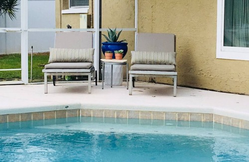 Please note that we only provide heat for the pool in the winter months. There is a "spa" feature to the pool where you can enjoy bubbles, but it's not heated. Also, although the back yard is fenced, the canal is not fenced off and serves as a natural barrier. That said, please do not leave children unattended in either the back yard or the lanai. It's best to always be cautious around water. If you would like the child safety barrier installed around the pool before your arrival we would be happy to set it up for you.