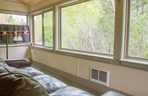 River Retreat has all the comforts of home. The kitchen is fully equipped with everything you need to prepare your own meals. There is also a relaxing patio including a gas grill for enjoying a barbecue. The main floor bedroom features a queen size bed, and the cozy upstairs includes two twin beds and plenty of charm. There is a spacious living room and dining area with a gas flame stove for our cool Colorado mornings. The enclosed porch offers a sofa and a chair in a cozy corner for sipping coffee or for curling up with a good book on a lazy afternoon. The cabin also offers satellite television and wireless internet access.
