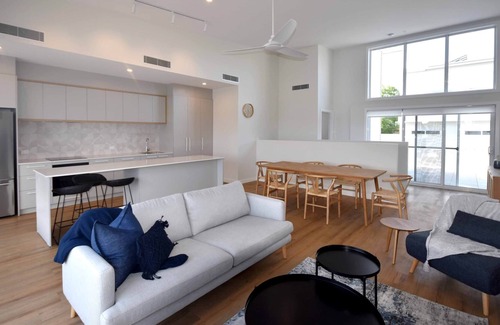 You will find the main ensuite bedroom on the first floor. The main ensuite bedroom offers a gorgeous queen bed with balcony deck access and built-in wardrobe. The ground floor second and third bedrooms offer a split king bed (configured as either two long single beds or one king bed) with access to the landscaped rear garden and built-in wardrobe.