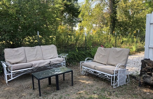 The back yard features a picnic table, seating area and a fire pit. Beach chairs and beach towels are provided as are all linens