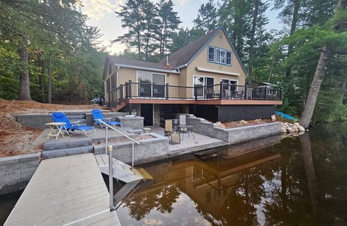 Beautiful lakefront home for summer family vacations in 2 bedroom (private 1 queen, 1 king and 2 twins on open second floor, and 2 pullout couches), one bathroom, sleeps 6- 10. Plenty of living space, indoors and out! Front and rear decks for sunning and shading, and beach with steps into the water. Less that 2 hours from Boston and 45 minutes to North Conway.