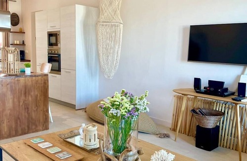 Indoors there is a cozy living room with an open plan fully equiped kitchen. Both bedrooms are comfortable with en-suite bathrooms and stylish decoration.
