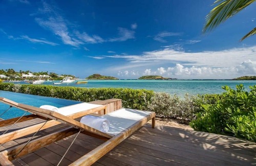 The elegant Villa is a unique beachfront villa located directly on the turquoise lagoon of Grand Cul de Sac , with private access to the beach in front of the large infinity pool and enjoying panoramic views of the warm and azure waters of the sea. A breathtaking view of the lagoon is the first thing to seduce the guests, and go out on the warm sand and dive straight into the blue-green ocean water that comes next.