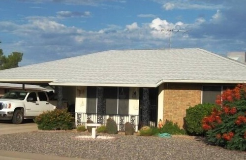 Sun City is a 55+ retirement community and one renter must meet the age requirement. Our home is a vintage styled retro home from the furnishings to the dishware even including some iron skillets for those who prefer that. It is a nonsmoking home, but smoking is allowed on the screened back porch. Our home is located on a quiet street with easy access to shopping, cultural, and sporting events. Tastefully decorated to allow for that homey feeling we seek ourselves when we travel. Master bedroom in simple Victorian allows guest to relax in quiet light with view of back yard. Guest bedroom is set up to meet the needs of those who require an office space for work or leisure. A desk is included for your convenience. The living room and dining area are themed around a 'Route 66/highway' theme and add a rustic charm. The bathroom is fullsize and offers full size tub & shower. A spacious screened Lanai allows for an early morning coffee break with rabbit viewing or a gander at the coveys of quail that love our area. We love to see all the babies trailing the mama quail with a for sure destination in mind. Take a break, just get away for a few nights or a few weeks to this sunshiny location on your next trip to Arizona's Valley of the Sun. Fall/Winter temperatures are perfect for outdoor activities and Spring/summer allows for inexpensive golf and various indoor activities at nearby recreation facilitie. If you enjoy a day at the casino, enjoy a free ride to Harrahs with twice daily departures from the Bell Rec center. We generally book snowbird season a year or more in advance.