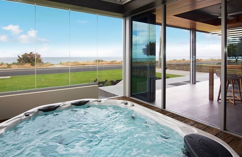 The 12 seater Jacuzzi is set at the front of the home, with a beautiful view out to the water. The room can be enclosed and locked for safety with small kids in the mix.
