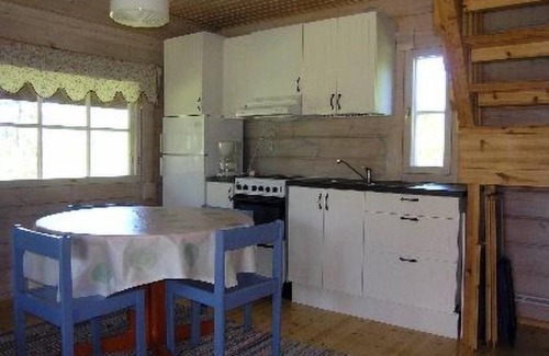Log cabin 2001, kitchen, bedroom (sliding door) with 2 beds, sleeping loft with 2 beds (beds isolated with curtains), balcony, sauna, wash room with toilet and shower, terrace. Entrance to sauna and toilet through terrace.