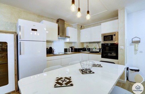 ✅ A large fully equipped kitchen designed for your stay, with all crockery, glassware, and kitchen utensils, kettle, coffee maker, microwave, oven, dishwasher and a refrigerator and a dining area.