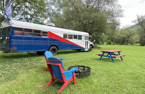 Tailgating Bus on Ischua Creek @ Campground Adventures | RV Rental in Hinsdale