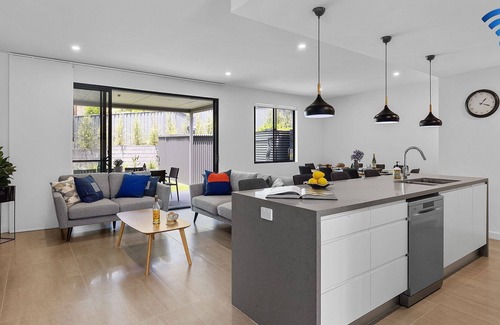 The open plan dining, lounge and kitchen overlooks the back yard with bi-fold doors to let the outside in. A master quality kitchen with De Longhi appliances, numerous coffee machines for your preferred method and 8-seater dining table completes the dining experience.