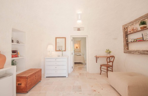 Each room has its own particularity, such as a small patio with seating, and a light-coloured décor reminiscent of the Apulian tradition. Each room has an en-suite bathroom with a shower. One of the rooms, the master bedroom, has a hallway with a sofa bed that accommodates two more guests and a characteristic stone fireplace.