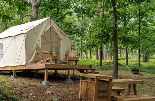 This campsite is equipped with a pre-set sturdy canvas tent on its own wooden deck platform. The tent is furnished with a queen-size memory foam mattress and side tables. A picnic table, fire pit with a grill, a solar shower, and portable camp loo are also provided, and campers are able to use the park's restroom facilities as well. There is an additional pop-up tent provided for extra guests, but you will have to bring your own air mattresses/sleeping pads for this tent.