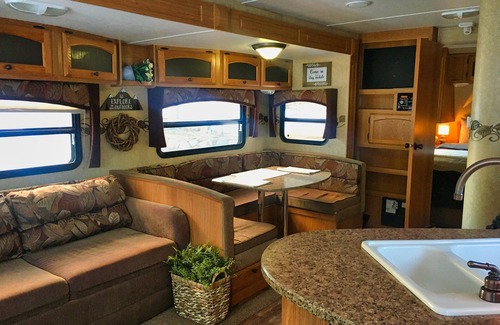 The 32-ft Dutchman Coleman camper has a private bedroom with a queen-sized bed, bathroom with shower, kitchen with stove and refrigerator, and living area with an additional pull-out queen-sized bed. Additional regular-size table top sleeping is also available for camper rating sleeps six. Complete with dishes, utensils, cookware, and linens, it is set up with everything you need for a cozy camping adventure. With private access to the national forest for hiking, hunting, horseback riding, and many other outdoor adventures, this idyllic setting is quiet and peaceful, and it can be yours to experience and enjoy.