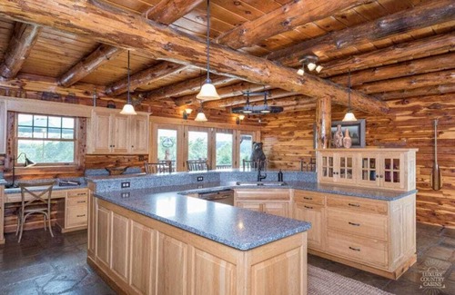 Escape to this luxurious custom cedar log home, offering panoramic views of 140+ acres. With 7,000 sq ft, it sleeps up to 16 guests, making it ideal for large families or groups. Enjoy spacious living areas, a fully equipped kitchen, cozy sitting areas, a bar, theatre and a game room featuring pool and arcade games. Outside, unwind in the hot tub and explore the expansive grounds. With 3.5 bathrooms, this home blends rustic charm with modern amenities for an unforgettable stay.