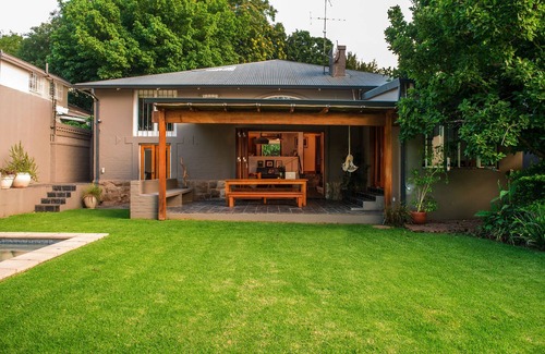 The house is open-plan and modern, with its own outdoor area and set in our peaceful garden. It is sunny, private and with high ceilings and a mezzanine bedroom area. full kitchen with microwave, toaster, kettle, fridge and but carefully selected cooking equipment. The two bedroom is furnished with comfortable double bed. It is ideal for one or two guests. If you wish to have a third guest that will be a squeeze but possible. The house provides space for your work and relaxation. Relax on the couch to enjoy the DSTV cable TV. Catch up on email and work at the work/dining table using the fast uncapped wifi. A lot about how we have designed the house is a result of our own experience of travelling and of what works for us when we travel. We have created a home away from home that has what a traveller needs in self-catered accommodation. We have furnished and decorated the house with art and design from southern Africa. From the house you would not guess that there are shops and restaurants in walking distance and that the city, Johannesburg’s universities and the vibey and popular nightlife of Melville are a ten minute drive away. The cottage is serviced once a week – it is cleaned, tidied and linen and towels changed. We are happy to arrange that the house are cleaned on extra days for a small additional fee. We don’t offer a laundry service and instead guests have access to a washing machine and washing line on the property. We also guide guests to the “drop and collect” laundry service in the neighbourhood. There is secure parking on the premises for two cars. Spacious, sunny house designed for your comfort? This is for you. Enjoy relaxed living with all the amenities. With parking. In Parkview, where you can walk, cycle and jog along the tree-lined roads and parks, close to shops and restaurants.
