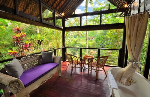 Imagine a unique property along a tropical forested gorge, at the top of one of Bali's rare, high caste sacred villages. Nearby, rice fields create a patchwork of verdant green and gold.