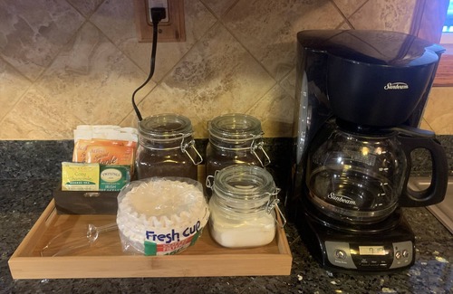 The kitchen is fully stocked with all the pots, pans, and utensils one might need to make just about any meal. Additionally, the kitchen comes stocked with coffee, decaf, tea, hot chocolate, and apple cider.