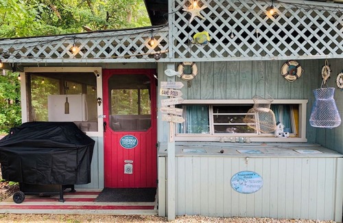 The Lake Shanty is a unique, fabulously decorated Camper with 1 bedroom, a kitchen table that converts to a full size bed, a bathroom, 2 covered porches - one that is screened in, 2 smart TV's, wifi, a mini kitchen with microwave, pots, pans, dishes, utensils, a full size refrigerator, sink, 2 top electric stovetop, griddle and big gas grill outside!