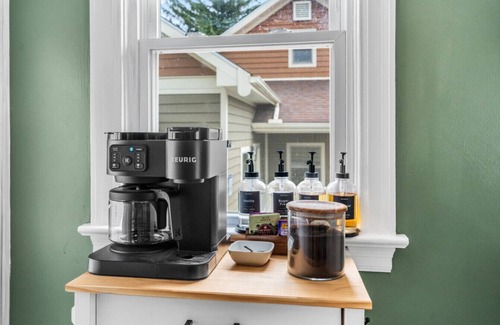 Coffee bar featuring dual Keurig & drip coffee maker, with coffee, creamers, sugar & syrups provided