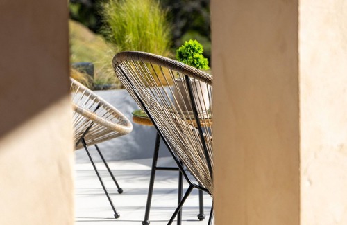 The Pyr Element: This retreat features a private swimming pool, a large living area with a sofa bed, a courtyard, expansive terrace, fully-equipped kitchen, and bathroom.