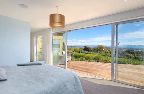 This stunning holiday home offers a captivating experience, boasting panoramic views to the north over the Appleby countryside and the glistening waters of Tasman Bay, as well as westward vistas across the Waimea Plains towards the majestic Mount Arthur and the Western Ranges. Nestled among maturing native plantings and extensive landscaping on its 1-hectare section, The Retreat guarantees tranquility, seclusion, and an idyllic setting for your vacation.