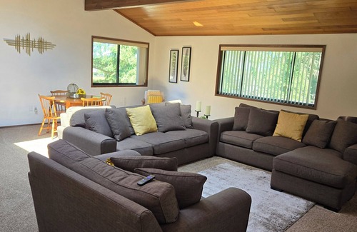 Surrounded by large fir trees, in a safe and quiet area and only a few minute drive to Sequim City limits. Our guest stay here because we are close to town, the beach and the Olympic Mountains. Large family room, galley style kitchen (well equipped), a generous size main bedroom with a closet and dresser, double vanity sinks and a laundry room. We have great parking, even enough if you're bringing a boat or RV and a freezer for your catch. Bonus room has a sofa bed for guests traveling with you.