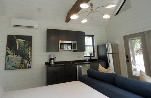 Now for details about the cottage. The Sloane is a 364 square foot studio cottage that features a king bed, kitchenette and living area, accompanied by stylish lighting and bohemian decor. The multiple full-length windows allow for fair amounts of natural light.