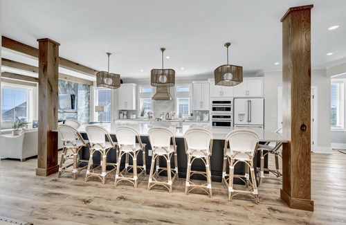 Custom chef’s kitchen with oversized island, generous cabinetry, and ocean views