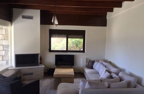 In the living room there is a spacious sofa corner, which can be used to accommodate another person, a 6-person dining room, cast iron fireplace, and a TV. From the lounge, guests have the opportunity to enjoy the stunning sea and canyon view through a 6m glass window. The open kitchen is fully equipped with a dishwasher, electric stove, washing machine, fridge, toaster, kettle and other amenities. The open-air area of 70 square meters offers a unique panoramic view of the sunset and the sea, through one of the most beautiful canyons in the area and guarantees romantic summer evenings!