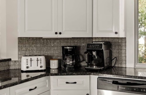 Upon entering this spacious 5 bedroom, 5,000 square foot home, guests will be greeted by a large staircase leading up to the three spacious bedrooms. To the left of the stairs is the formal dining room with seating for 10. From the dining room, you can enter into the living room which has a sectional, Roku Smart TV and sliding glass doors that lead out to a small balcony that overlooks the backyard. Between the living room and the kitchen, there is a breakfast table that seats another four people and two additional bar stools at the kitchen counter. Circling back around to the front door, there is a designated office space attached to the kitchen with a desk and office chair in front of a large window, with lots of natural light pouring in. Through the living room, you'll find the first of five bedrooms - the master bedroom with high ceilings, a private bathroom, a small nursery, a fireplace, private entry to the balcony and a staircase leading up to tall bookshelves on the second floor. There is a door leading into the rest of the second floor from this library area, however it can be locked if guests prefer the privacy.
