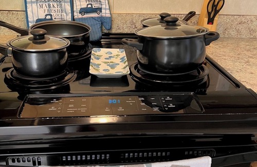 Step inside this quaint 1-bedroom, 1-bathroom haven and immediately feel at home. The bedroom is adorned with comfortable linens, ensuring a restful night's sleep after a day of adventure. In the full kitchen, discover the convenience of a coffee maker, microwave, plate settings for 4, and cookware, allowing you to whip up delicious meals at your leisure.